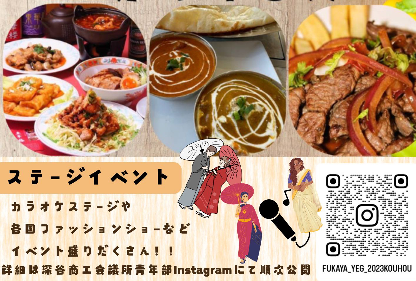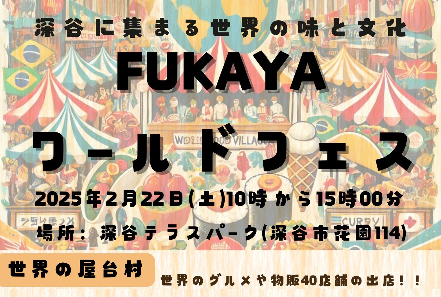 2/22(土)10時~15時に深谷テラスパーク内にて行われる「FUKAYAワールドフェス」にて、弊社で働いている特定技能生、技能実習生、インターン生の皆さんが飲食店を出店することになりました!当日は世界各国の料理や物販の他、各種イベントなど行われる予定ですので、是非お立ち寄りください。>リーフレット